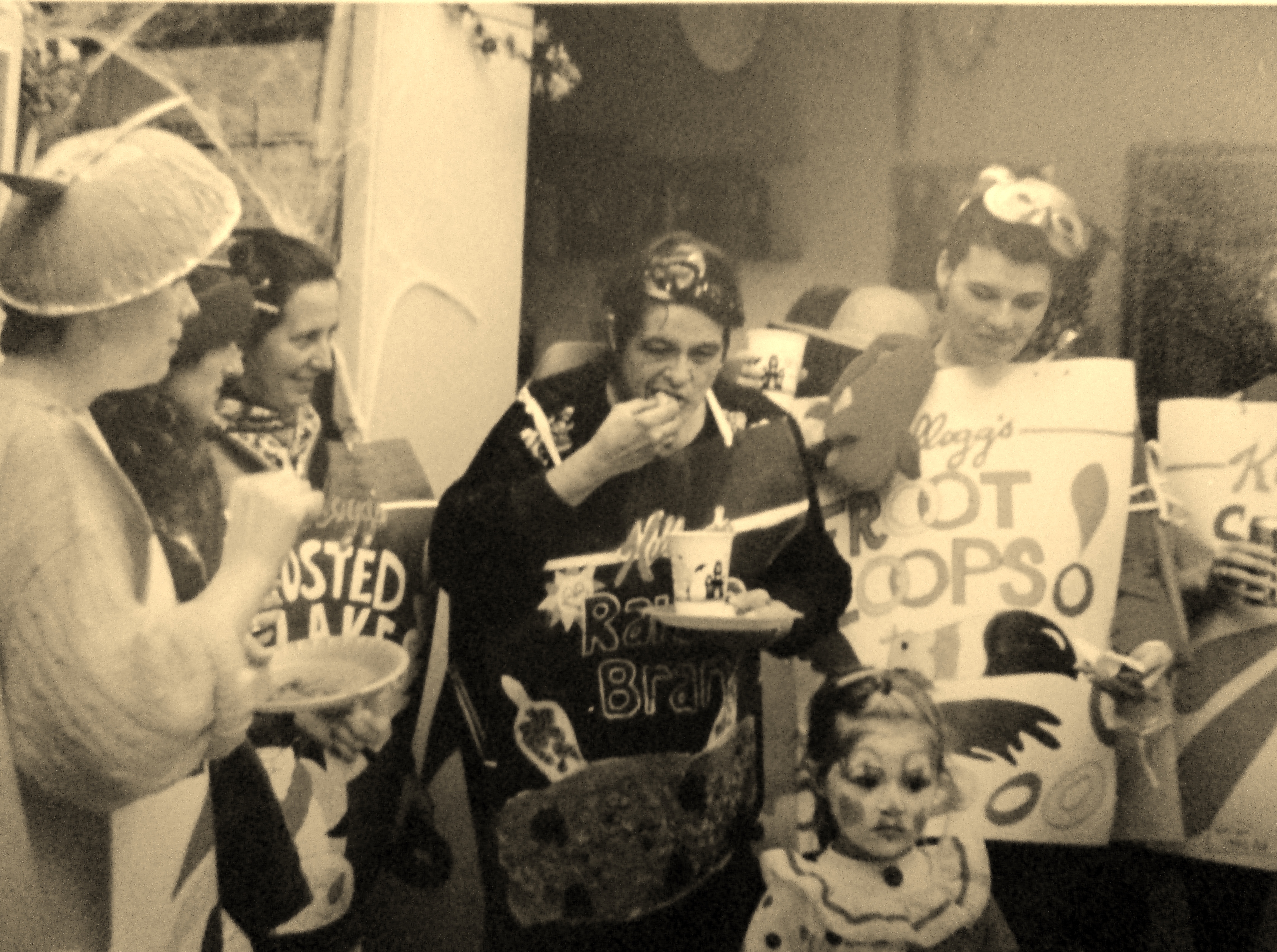’94-This is a group from the 2nd Home Health Job. It was a costume party and our “Southside” office competed against the “Downtown” office. I came up with the theme of “Southside Cereal Killers” and drew all of the different types of cereal boxes and each one came up with their own accessories. I am the one with the bowl and spoon on my head.