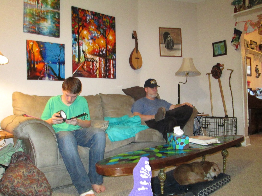 Isaac figures out all the technology as I sit in my usual spot. The purple socks are mine. Sammy still sleeping!