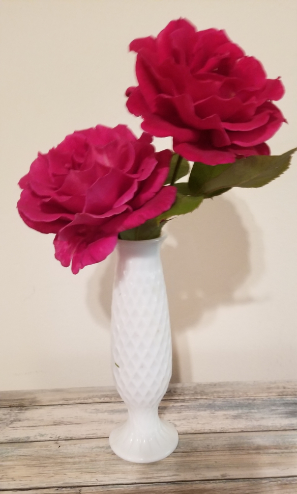 I planted a rosebush in my yard specifically for cutting, but rarely catch the blooms at their peak, as I did with these two. I forget to check. Summer heat is not my favorite, especially with the humidity in central VA that comes along with it. It isn’t even summer yet, officially, but near the 90 degree mark several times already.