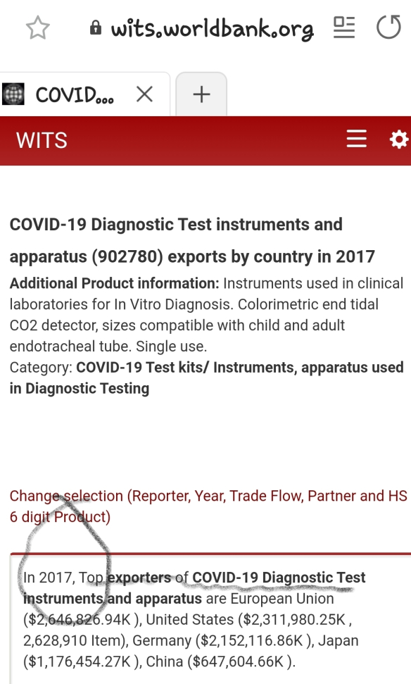 2017 Export stats by nation, of Covid-19 testing instruments and apparatus? By STLloyd September 6, 2020 Corruption Internatiional Commerce World Bank H/T Linda https://wits.worldbank.org/trade/comtrade/en/country/ALL/year/2017/tradeflow/Exports/partner/WLD/nomen/h5/product/902780 Rate this:If you liked it, pass it on! Click to print (Opens in new window) Print Tweet Click to share on Reddit (Opens in new window) Reddit Click to email a link to a friend (Opens in new window) Email Share on TumblrPocket Click to share on Telegram (Opens in new window) Telegram Like Loading... Related