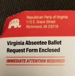 It could be there are none from Dem party only because our household isn’t on the Democratic Party’s radar. But I don’t like the fact the Republicans are mass-mailing the ballot requests any more than I like the Dems doing it. VA flips red/blue every election or two. Currently it is Blue.