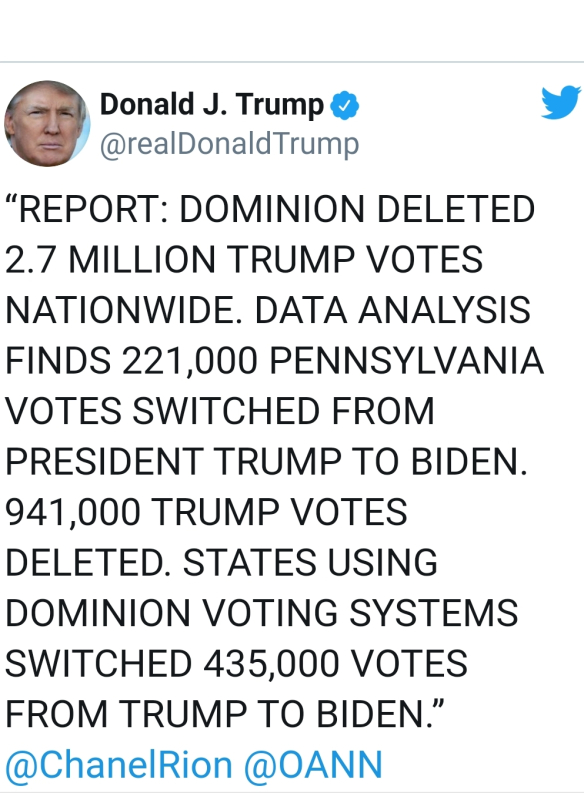 2.7 million Trump votes deleted country-wide by Dominion By STLloyd November 13, 2020 2020 election fraud President Trump! But “will it matter?”, is the question.–STL Rate this:If you liked it, pass it on! Click to print (Opens in new window) Print Tweet Click to share on Reddit (Opens in new window) Reddit Click to email a link to a friend (Opens in new window) Email Share on TumblrPocket Click to share on Telegram (Opens in new window) Telegram Like Loading... Related