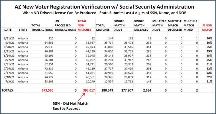 In the last 10 weeks, Arizona has checked the voter registration credentials with the Social Security Administration (SSA) on 673,560 applicants. This is a massive volume considering most States including Arizona typically process around 2,500 a month. They’ve processed more identities in the last 2 months than they’ve done in the last 9 years combined.…