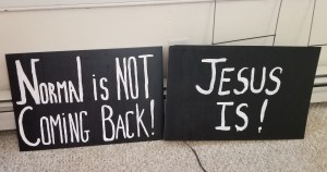 Repurposing yard signs from the VA midterm campain, into a witness and warning. Our side street is a pretty busy road. So these are front and back, so the message will be visible to cars going both directions, and like the old burmashave signs, it will be continued on the next sign.