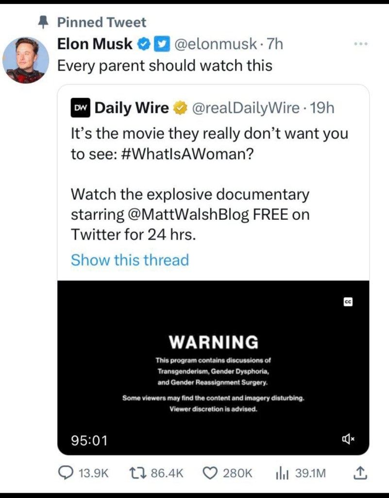 Twitter staff fired for censoring Matt Walsh documentary “What’s a Woman?: By STLloyd June 3, 2023 censorship Confusion and lies Elon Musk Gender ideology Transgender Twitter/X Rate this:If you liked it, pass it on! Click to print (Opens in new window) Print Tweet Click to share on Reddit (Opens in new window) Reddit Click to email a link to a friend (Opens in new window) Email Share on TumblrPocket Click to share on Telegram (Opens in new window) Telegram Like Loading... Related
