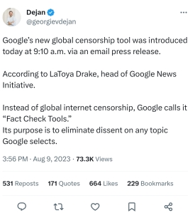 Google Announces Worldwide Ban on Independant Media from search Results By STLloyd September 3, 2023 Big Tech censorship Corruption google Marxist tactics Tyranny Source: Google Announces Worldwide Ban on Independant Media From Search Results Rate this:If you liked it, pass it on! Click to print (Opens in new window) Print Tweet Click to share on Reddit (Opens in new window) Reddit Click to email a link to a friend (Opens in new window) Email Share on TumblrPocket Click to share on Telegram (Opens in new window) Telegram Like Loading... Related