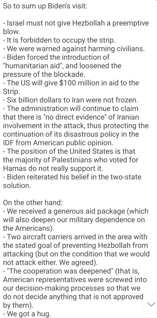 The American “support” to Israel is just buying influence.Biden didn’t go to Israel to see how he could help. He went to tell Israel what they will or won’t be permitted to do. Our Tax dollars to Hamas in the guise of “humanitarian aid” is a joke, and doesn’t represent the will of a majority of Americans. Most Americans seem to want us to just stay out of it. The rest supprt the aid to Israel, but not to Hamas. In my opinion, Biden pandered to the way-too-many Middle-Eastern illegal “immigrants” that the Obama’s 3 terms have brought to America, and have allowed into influental positions within our government, (Rashida Tlaib, Ilhan Omar. All part of the takedown of America from within) The “help” of Britain to Israel is the same. All a show for political standing, but really only towards globalistic ends. They give (appeasement for both sides) with one hand while they take (Israel’s Sovereignty and dignity) with the other.–STL