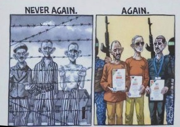 Former hostage Eli Sharobi presented this framed image to Trump in the Oval Office. Sharabi himself is depicted in the editorial cartoon. The photo is from the Jewish Chronicle. I could not find artist signature on the image, nor any attribution to the unknown artist.